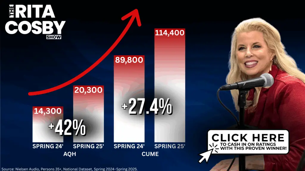 The data is undeniable: Rita Cosby’s audience is growing fast, and that growth is translating into real momentum across the network. According to Nielsen’s National Dataset, her reach and engagement have both surged year over year, proving that her shows aren’t just connecting with listeners; they’re commanding attention.