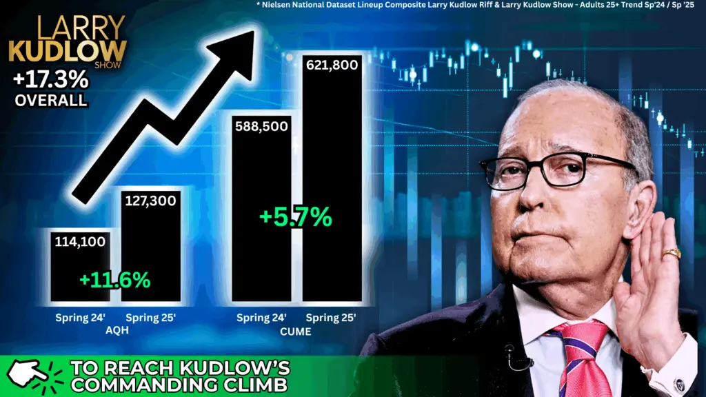 The Average Quarter-Hour (AQH) audience increased from 114,100 to 127,300, an impressive +11.6% year-over-year gain. In the crowded talk-radio marketplace, double-digit AQH growth is not just a win, it’s a statement. It’s the audience saying: Kudlow is where the smart conversations happen.