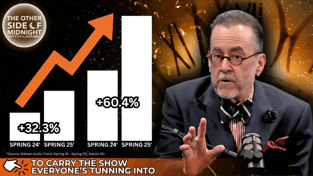 When most stations assume listeners are asleep, Lionel is building a broadcast empire at 1 a.m. According to Nielsen Audio Trend data (Spring ’24 → Spring ’25, Adults 35+), The Other Side of Midnight delivered a massive +60.4% increase in AQH, jumping from 22,700 to 36,400 listeners. Even more striking: the show’s Cume surged +32.3%, growing from 110,000 to 145,500 in just one year.