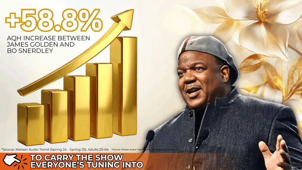 According to the latest Nielsen Audio Trend data (Spring ’24 to Spring ’25), both of his signature programs are experiencing significant year-over-year audience growth. The weekend James Golden Show posted a remarkable 24.4% AQH increase among Adults 35+, climbing from 52,000 to 64,700. Weekend growth of that magnitude is rare, and it’s a clear sign that listeners aren’t just casually scanning the dial, they’re intentionally choosing to spend their Saturday mornings with Bo and staying locked in.
