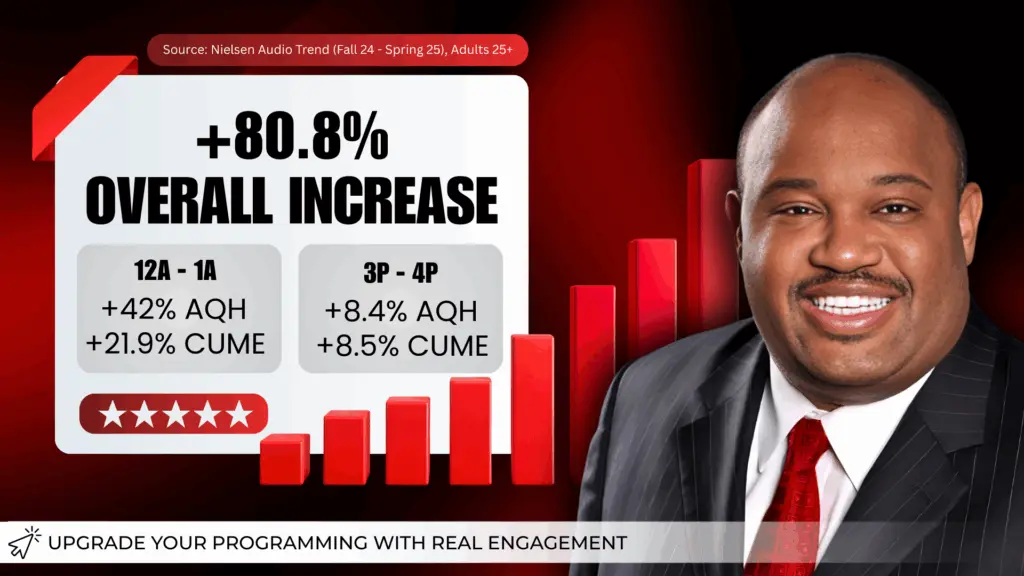 Dominic Carter, whose two talk shows on Red Apple Audio Networks are delivering impressive audience momentum, proof positive that compelling analysis and sharp commentary still matter in an evolving talk radio landscape. According to Nielsen Audio Trend data (Fall 2024 → Spring 2025, Adults 25+), The Dominic Carter Show in its overnight 12a – 1a ET run posted a remarkable +42% increase in AQH, growing from 26,200 to 37,200. Over the same period, its weekly reach (Cume) climbed +21.9%, increasing from 82,100 to 100,100, signaling that not only are loyal listeners tuning in more regularly, new listeners are discovering Carter’s unique voice overnight. In the afternoon, Carter’s 3p – 4p show also showed solid gains year over year: from Spring 2024 to Spring 2025, average quarter-hour listening among Adults 25+ rose +8.4% (from 45,200 to 49,000) with Cume up +8.5% (from 179,000 to 194,300), reinforcing its appeal during a highly competitive drive-time window. Together, these trends represent a show that resonates across both late-night and afternoon audiences, expanding reach and deepening engagement in two very different dayparts that matter to affiliates and advertisers alike. Source: Nielsen Audio Trend (Spring 24 – Spring 25 and Fall 24 – Spring 25), Adults 25+.