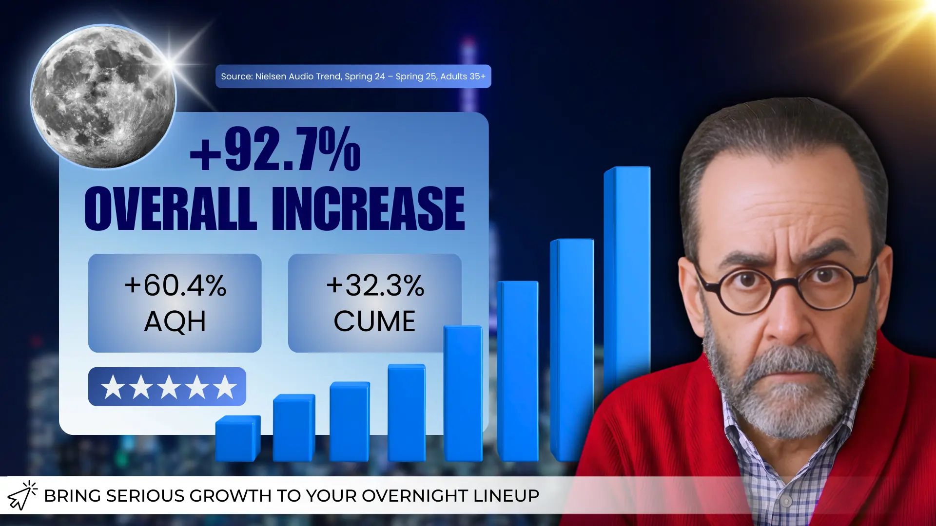 This week we’re spotlighting Lionel and his late-night powerhouse, The Other Side of Midnight, a program that is not just growing, but accelerating. According to Nielsen Audio Trend data from Spring 2024 to Spring 2025 among Adults 35+, the show posted a remarkable 60.4 percent increase in Average Quarter Hour listening, surging from 22,700 to 36,400. That kind of year-over-year jump is extraordinary in any daypart, but especially in late night, where audience loyalty and consistency are everything. Even more impressive, weekly reach climbed 32.3 percent, expanding from 110,000 to 145,500 listeners. This is not incremental growth. It is a significant expansion of both depth and breadth, meaning more people are discovering the show and spending more time with it once they do.
