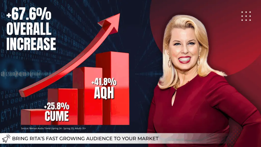 Rita Cosby continues to prove why she is one of the most trusted and compelling voices in news/talk radio, delivering both powerful content and undeniable audience growth. According to Nielsen Audio Trend data from Spring 2024 to Spring 2025 among Adults 35+, The Rita Cosby Show posted a 41.8% increase in Average Quarter-Hour listening, climbing from 14,100 to 20,000, while total weekly reach surged 25.8%, expanding from 86,500 to 108,800 listeners. These gains reflect more than momentum, they signal a program that is deepening listener loyalty while simultaneously attracting a growing audience in a high-value demographic. For affiliates, this combination of rising AQH and expanding Cume translates directly into stronger appointment listening, increased market impact, and greater revenue opportunity.